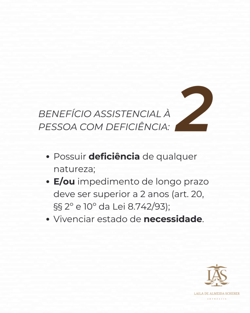 2️⃣Benefício Assistencial à Pessoa com Deficiência: destinado às pessoas com deficiência que estão impossibilitadas de participar e se inserir em paridade de condições com o restante da sociedade.